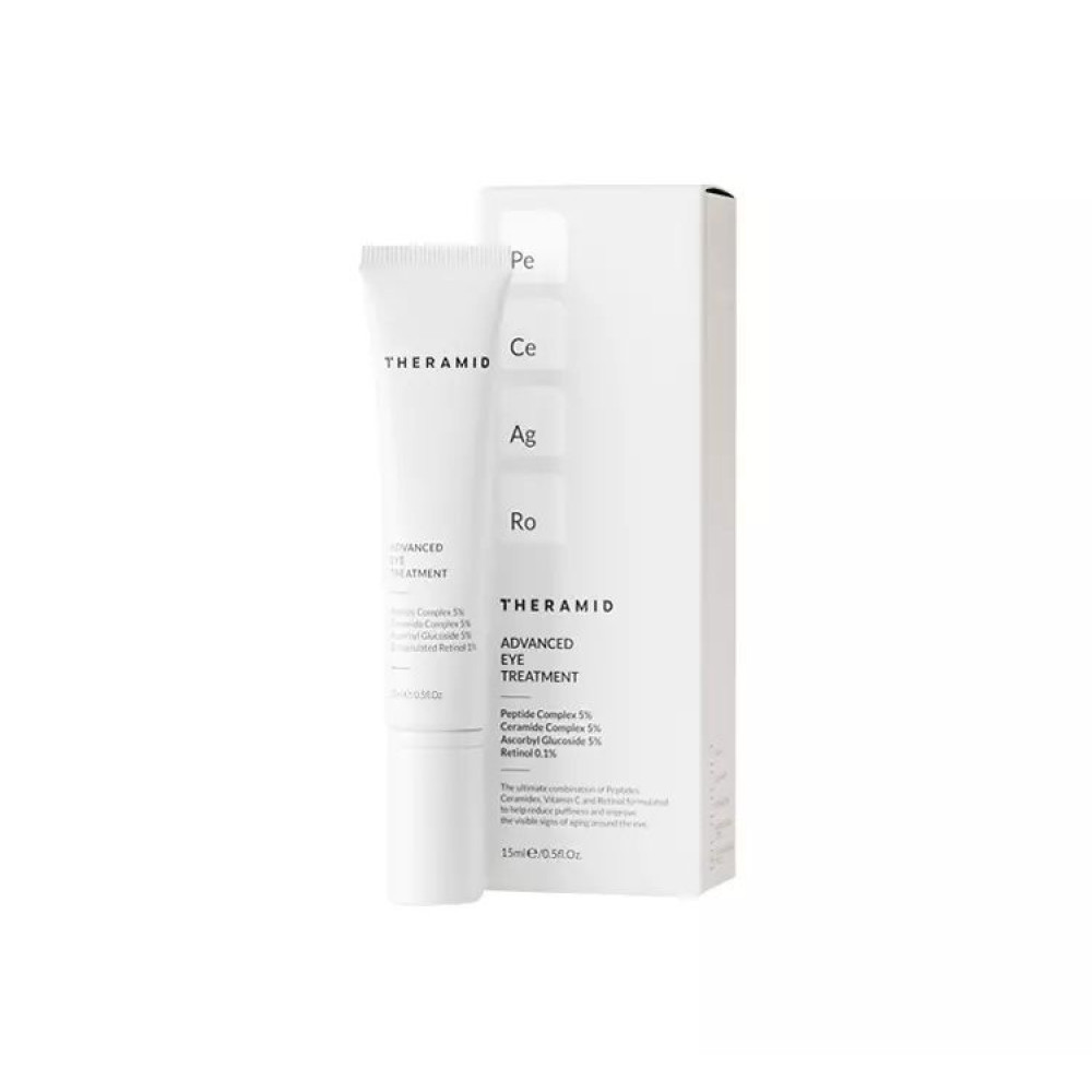 Високоефективний омолоджуючий засіб для догляду за делікатною та ніжною зоною обличчя. Бореться з усіма видимими ознаками старіння шкіри навколо очей, глибоко зволожуючи, живлячи та зміцнюючи в'ялий шкірний покрив. Заспокоює будь-яке подразнення, спричинене негативним впливом зовнішніх факторів. Допомагає зменшити набряки, темні кола, сліди стресу, втоми, відновлюючи молодість шкіри, надаючи їй молодший, пружний і сяючий вигляд. Формула поєднує в собі пептиди, вітамін С та ретинол, синергія яких сприяє зменшенню проявів зморшок для свіжішого та доглянутішого вигляду, а комплекс з керамідів у складі пом'якшує та живить зону навколо очей. Текстура крему приємна, трохи тягуча, але розподіляється по шкірі досить легко. Зручне пакування з дозатором робить нанесення гігієнічним та швидким. Регулярне використання Theramid Advanced Eye Treatment зробить шкіру навколо очей гладкою, шовковисто-м'якою, відновленою та наповненою комфортом.