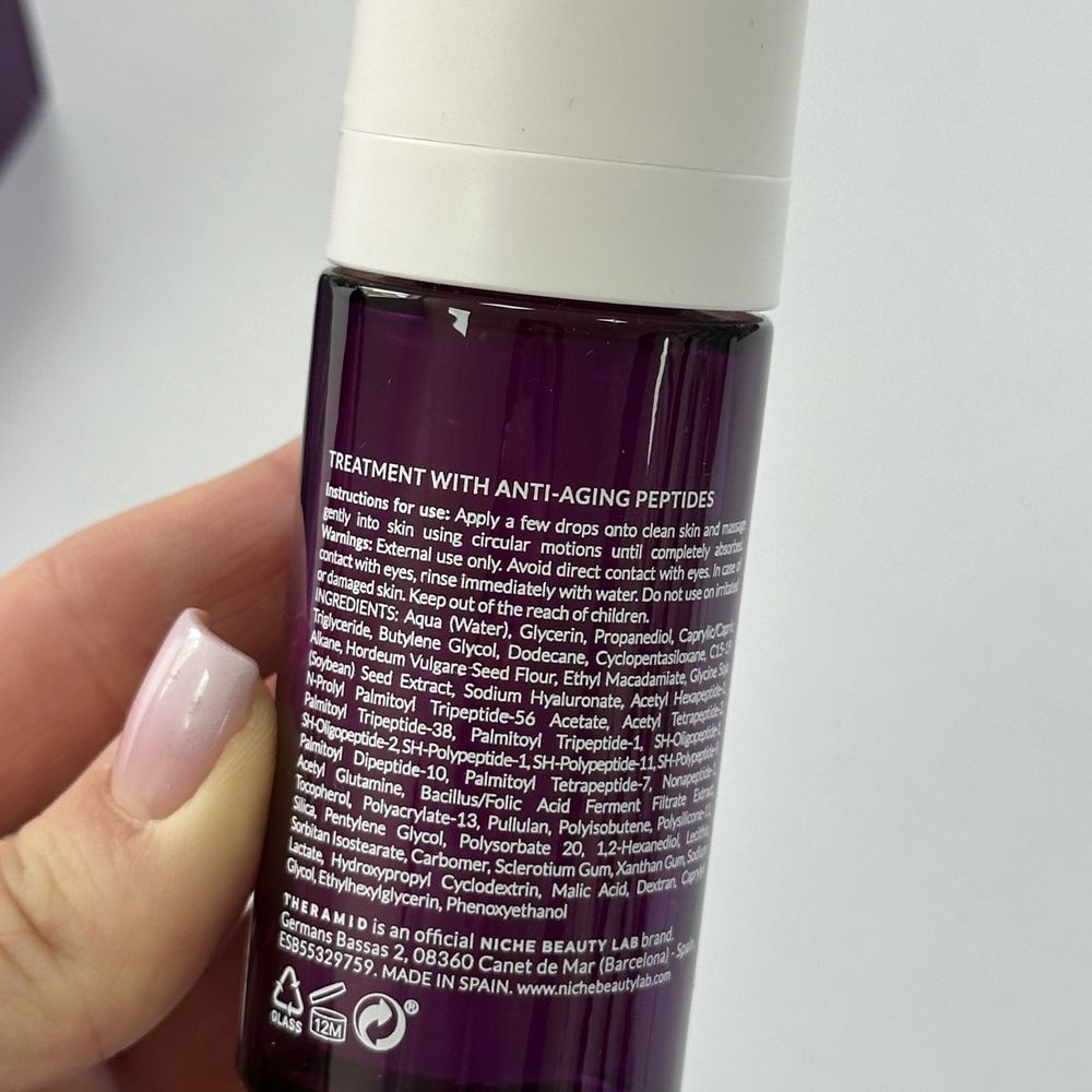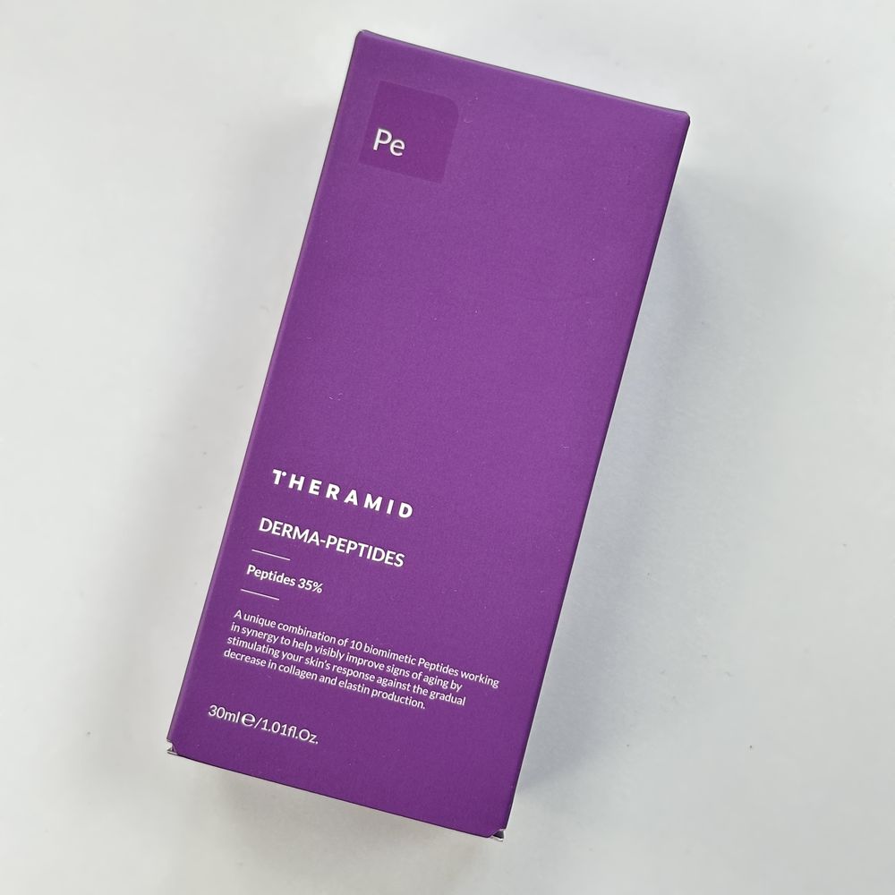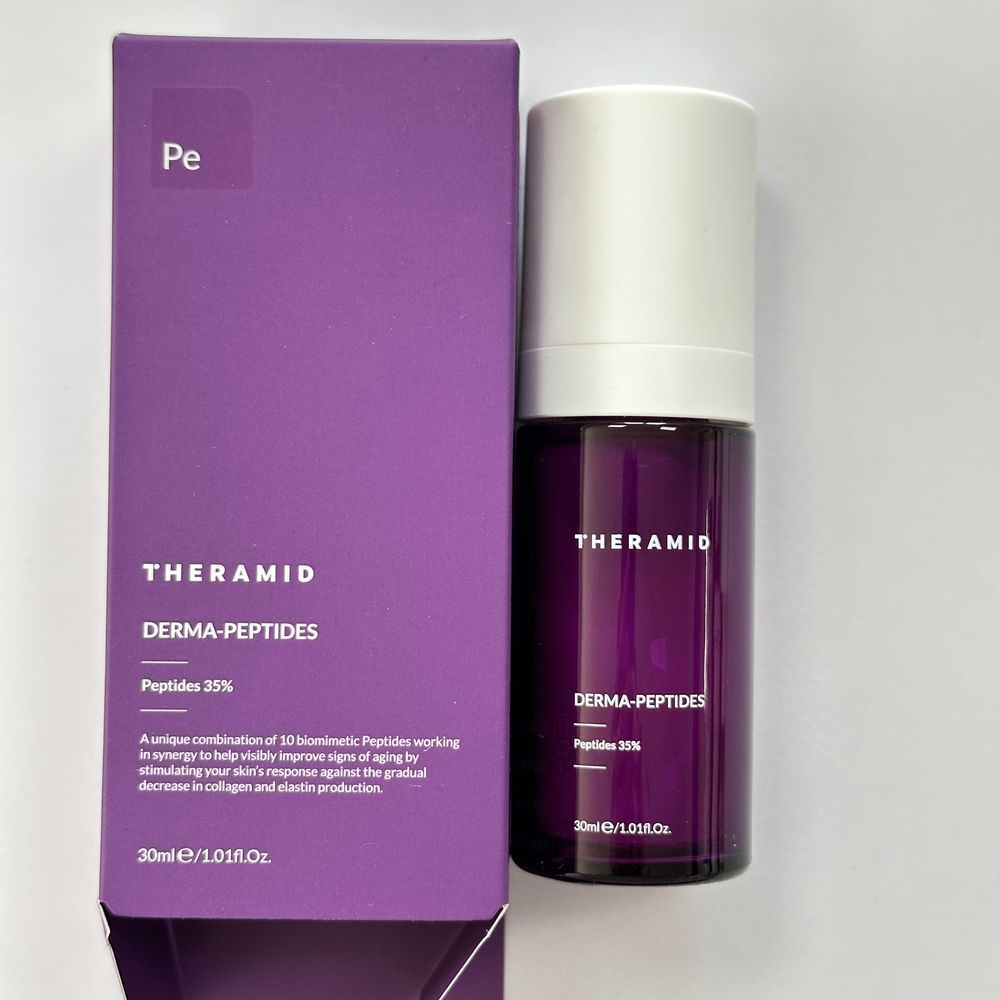 Мультипептидна сироватка з покращеною формулою, має збільшену концентрацію пептидів до 35 %. Така концентрація забезпечує комплексний антивіковий догляд, спрямований на омолодження шкіри, зволоження, відновлення та боротьбу з пігментацією. Засіб з підвищеною ефективністю покращує стан шкіри, зменшує та попереджає ознаки старіння. Унікальні біометричні пептиди, які практично ідентичні тим, що виробляються в людському організмі, компенсують дефіцит власних компонентів шкіри та сприяють її оновленню. THERAMID Derma Peptides має м'яку текстуру, залишає приємне відчуття свіжості.