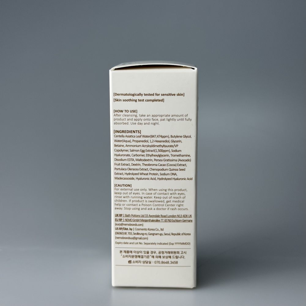 | Склад | Centella Asiatica Leaf Water (847,474ppm), Butylene Glycol, Water, Propanediol, 1,2-Hexanediol, Glycerin, Sodium DNA, Salmon Egg Extract (1,500ppm), Madecassoside, Portulaca Oleracea Water, Persea Gratissima (Avocado) Fruit Extract, Maltodextrin, Hyaluronic Acid, Hydrolyzed Hyaluronic Acid, Theobroma Cacao (Cocoa) Extract, Chenopodium Quinoa Seed Extract, Hydrolyzed Wheat Protein, Betaine, Dextrin, Sodium Hyaluronate, Carbomer, Ethylhexylglycerin, Ammonium Acryloyldimethyltaurate/VP Copolymer, Tromethamine, Disodium EDTA Зазначений склад є ознайомчим і може бути не точним з різних причин (зміна складу виробником, помилки при наповненні сайту та інше). Точний склад дивіться на етикетці чи упаковці засобу. |