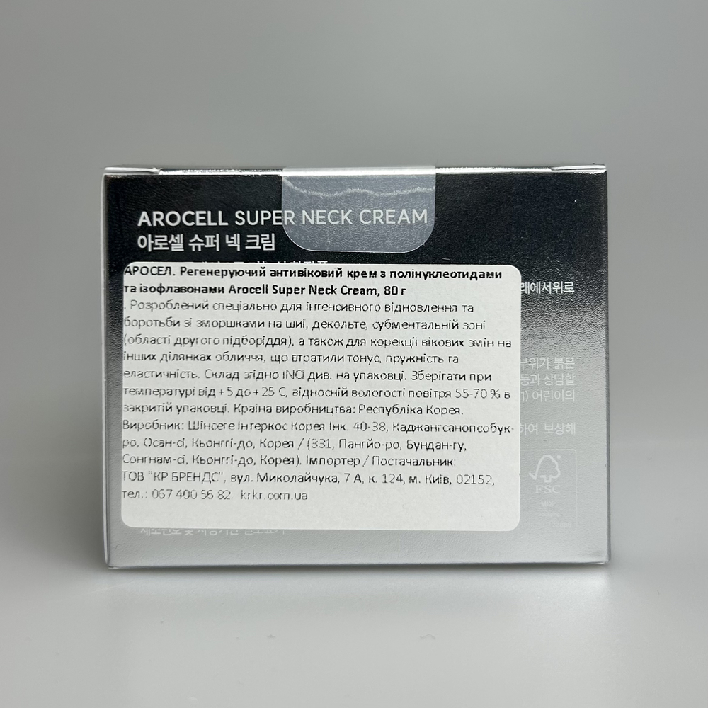 Суперпотужний крем, який забезпечує високу еластичність та потужний антивіковий догляд для шиї та області декольте. Засіб ефективно бореться з ранніми проявами гравітаційного птозу, зменшує вираженість вертикальних і горизонтальних зморшок на шиї, відновлює пружність та еластичність, підвищує щільність шкіри й запобігає її в’ялості та провисанню. Він допомагає повернути чіткість контурам обличчя та лінії щелепи, одночасно вирівнюючи загальний тон епідермісу. Подвійна функція крему поєднує антивікову дію (ліфтинг та розгладження зморшок) та освітлення, в результаті шкіра набуває більш підтягнутого, гладкого, еластичного вигляду з рівним тоном і природним сяйвом. Крем Arocell Super Neck Cream являється мультизональним, розроблений спеціально для інтенсивного відновлення та боротьби зі зморшками на шиї, декольте, субментальній зоні (області другого підборіддя), а також для корекції вікових змін на ділянках навколо очей та губного контуру. Активи крему інкапсульовані в ліпофільні капсули з лецитином і пантенолом, які інтегруються в ліпідний шар шкіри, забезпечуючи глибоке проникнення активів та триваліший і помітніший результат. Густа суперпоживна текстура крему з рідкокристалічною (ламелярною) структурою утримує вдвічі більше вологи, ніж звичайні креми, забезпечує високу дерматологічну сумісність, пролонгований ефект, швидко вбирається без липкості та дискомфорту.