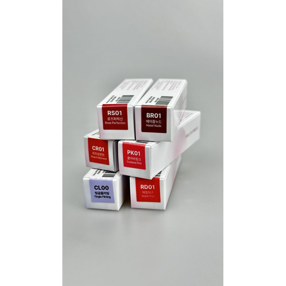 - CL00 TINGLE FLIRTING - надання обʼєму. М'яке покриття з ніжно-фіолетовим перламутровим блиском (не містить тінту). Призначено для нанесення як верхній шар для надання глянцевого блиску, як блиск для губ. Розроблено для найкращого змішування з іншими продуктами лінійки.